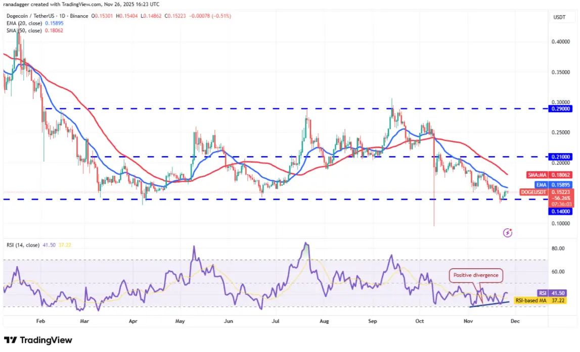Восстановление Dogecoin (DOGE) из зоны поддержки 0,14 USD в настоящее время сталкивается с сопротивлением на уровне EMA 20 на 0,16 USD, что указывает на то, что медведи пытаются сохранить контроль.