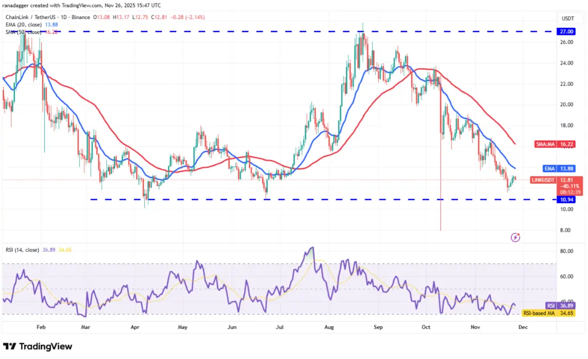 График LINK/USDT на дневном таймфрейме | Источник: TradingViewЕсли цена упадет с 20-дневной EMA, медведи постараются затащить пару LINK/USDT к сильной поддержке на уровне 10,94 USD. Покупатели, как ожидается, будут защищать уровень 10,94 USD изо всех сил, так как пробой этого уровня может привести пару к 7,90 USD.