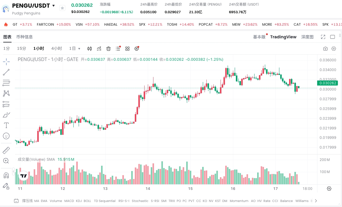 กราฟ PENGU แสดงแนวโน้มการดันที่มั่นคง ราคาของ PENGU แตะจุดต้านที่เดียวกันหลายครั้ง จนถึงปัจจุบัน ขาขึ้นยังไม่สามารถทำลายจุดต้านนั้นได้.