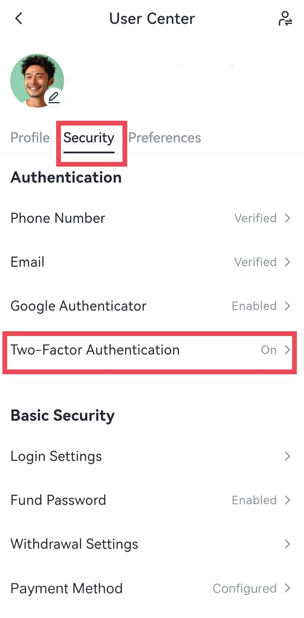 Gate mobil uygulamasını açın ve hesabınıza giriş yapın. Sol üstteki profil simgesine tıklayın ve ardından "Profil ve Ayarlar 'a tıklayın , İki Adımlı Doğrulamayı etkinleştirmek için "Güvenlik" > "İki Adımlı Doğrulama" seçeneğine gidin.