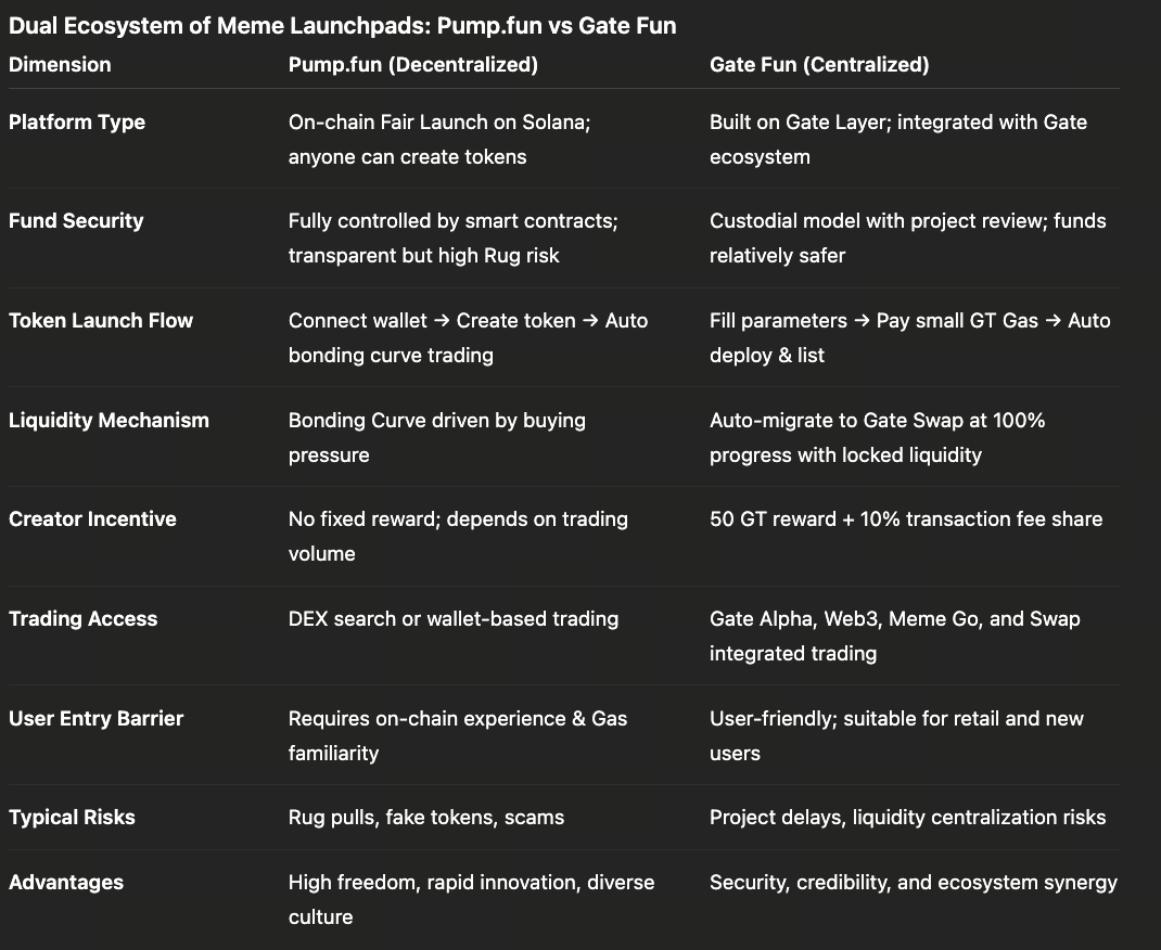Compared to Pump.fun’s “decentralized explosion”, Gate Fun represents a “regulation-friendly + controllable liquidity” Meme Launchpad model, also opening a new entry point for centralized exchanges into the Meme ecosystem.