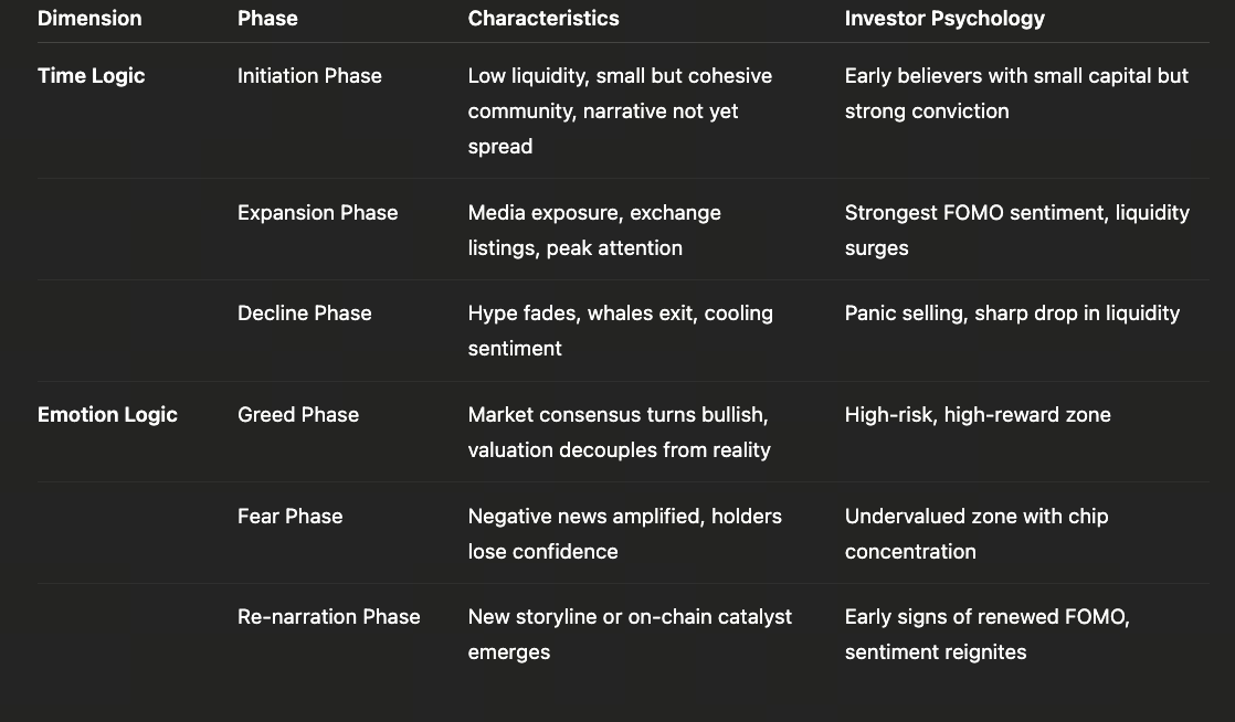 Meme coins experience volatile price fluctuations and short life cycles, making the grasp of investment timing particularly crucial. Unlike assets such as Bitcoin or Ethereum, which have long-term technological and ecosystem support, meme coins often rely on the strength of narrative, propagation, and emotions. Therefore, understanding the complete cycle of meme coins from birth to decline not only helps investors discover opportunities but also avoids being “consumed by emotions” at high points.