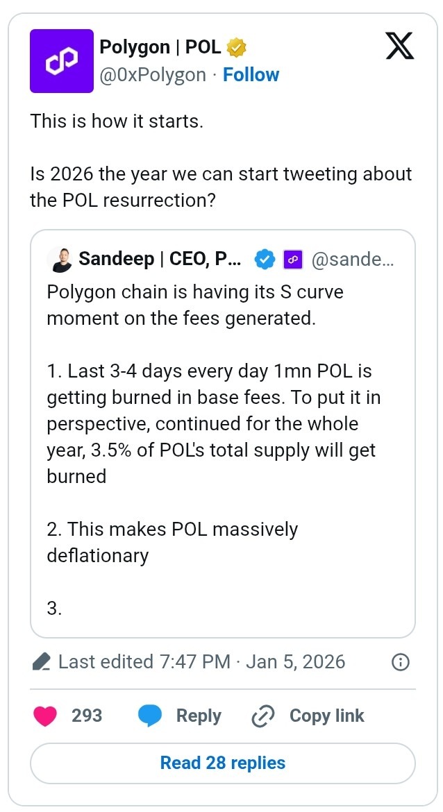 Polygon Foundation CEO Sandeep Nailwal has labeled 2026 as a year of Polygon (POL) resurrection. Explaining this in three points, he pointed out that 1 million POL in base fees have been burnt in the last three to four days. According to the CEO, this trend is expected to continue for the remainder of the year. Mathematically, repeating this trend for the whole year could see 3.5% of POL’s total supply burnt. Technically, Nailwal highlighted that this situation makes Polygon deflationary. On another point, he highlighted that 3.6 billion POL has currently been staked. In total, stakers and validators earn around 1.5% of POL in rewards. These have shrunk the supply of the asset and positioned it for a possible price surge.