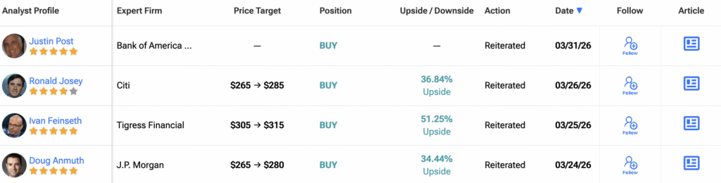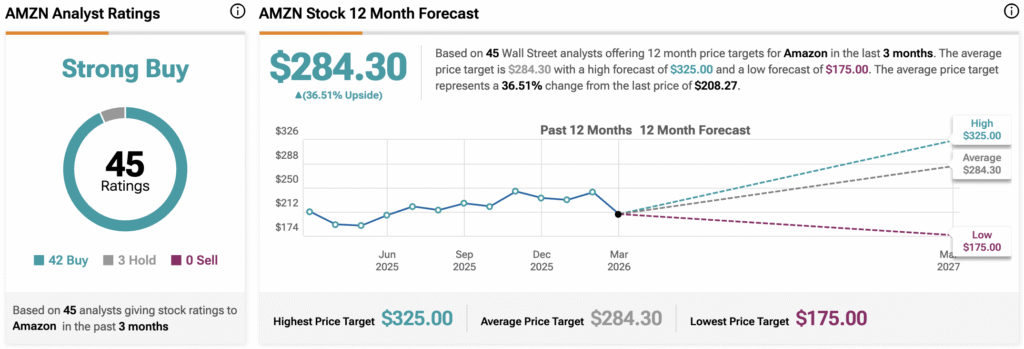 Turning to Wall Street, the analysts’ consensus rating for Amazon stock (AMZN) is a Strong Buy, based on 42 Buys, three Holds, and no Sell ratings issued over the past three months. With that comes an average 12-month AMZN stock price target of $284.30, representing a potential 36.5% upside for the shares.