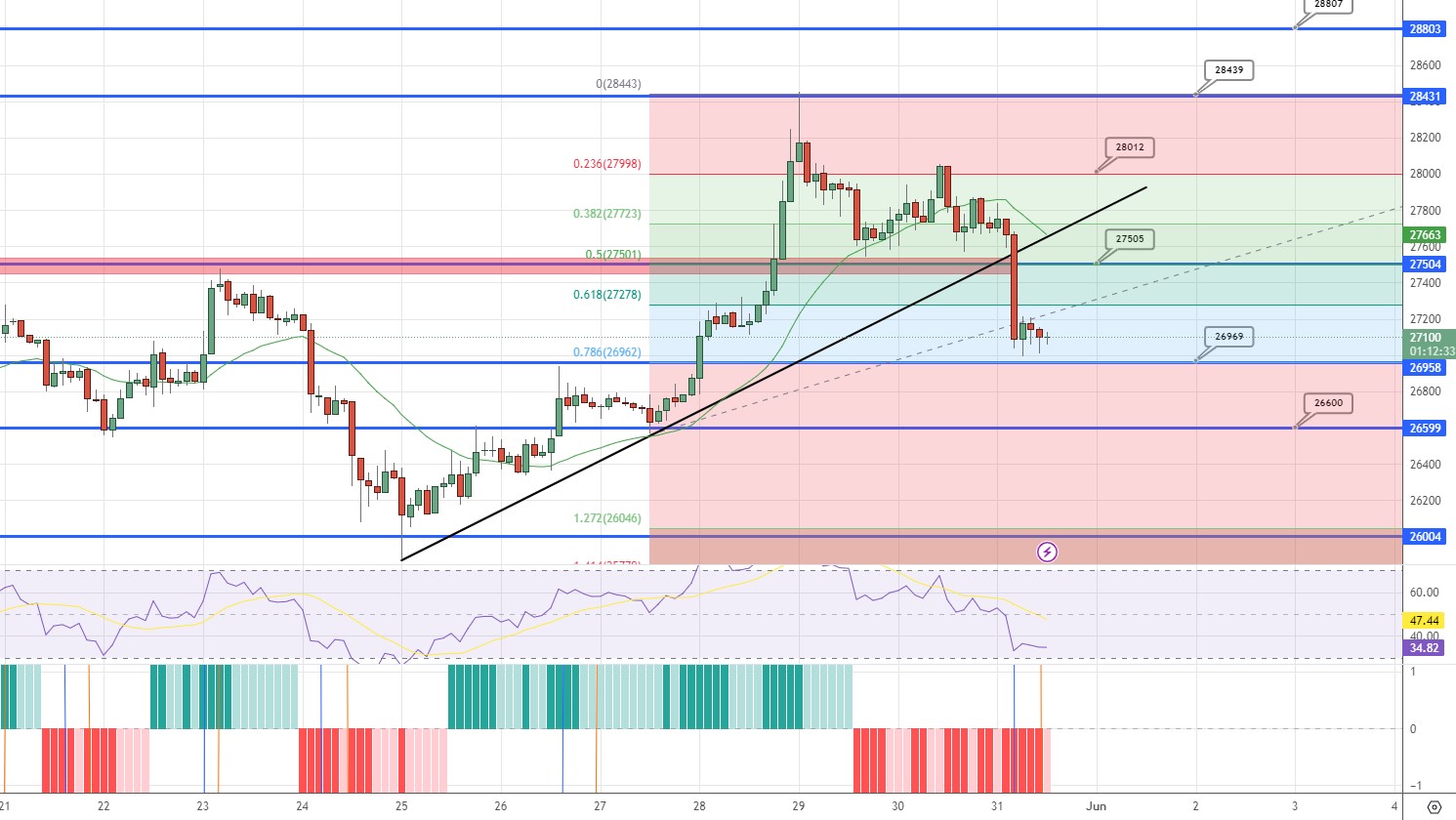 The RSI and MACD, both important technical indicators, are currently in the bearish zone. Therefore, it is crucial to keep an eye on the $27,500 level for potential reversals and, on the downside, closely monitor the $26,900 level