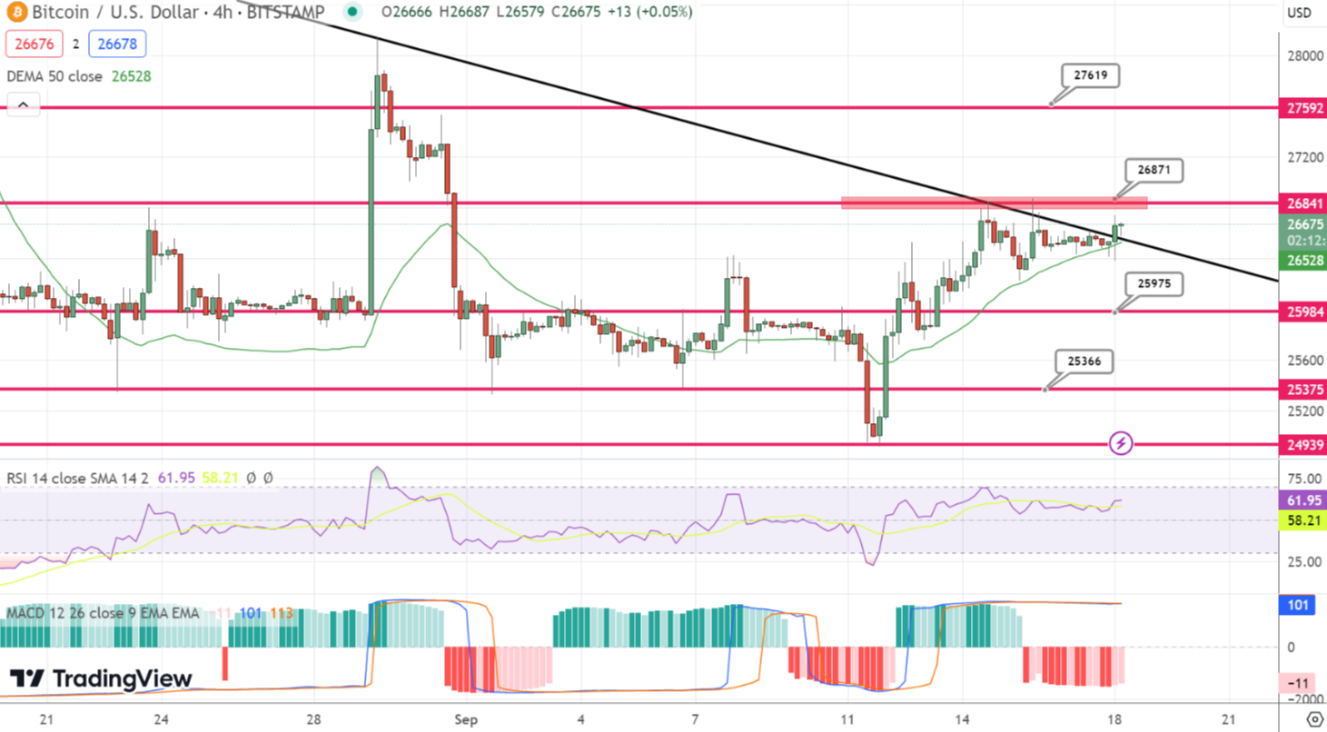 Bitcoin’s technical analysis shows a slight bearish tendency. Currently, Bitcoin is stable near the $26,800 resistance, just above the $26,500 support, indicating a potential double-top pattern