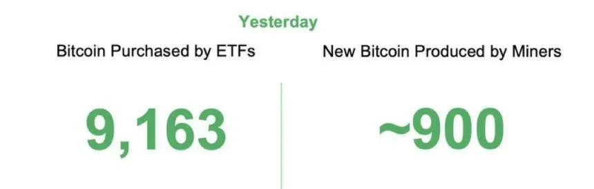 More importantly, is the impact of the new spot BTC ETFs that are beginning to pick up in demand and net flows. Each ETF provider must purchase a corresponding amount of Bitcoin based on the demand for ETF shares. This week, ETFs purchased a grand total of 9,163 BTC in a single day. The same day, BTC miners only produced around 900 BTC. This suggests that ETFs are currently exceeding the new supply of Bitcoin by ten times a day.