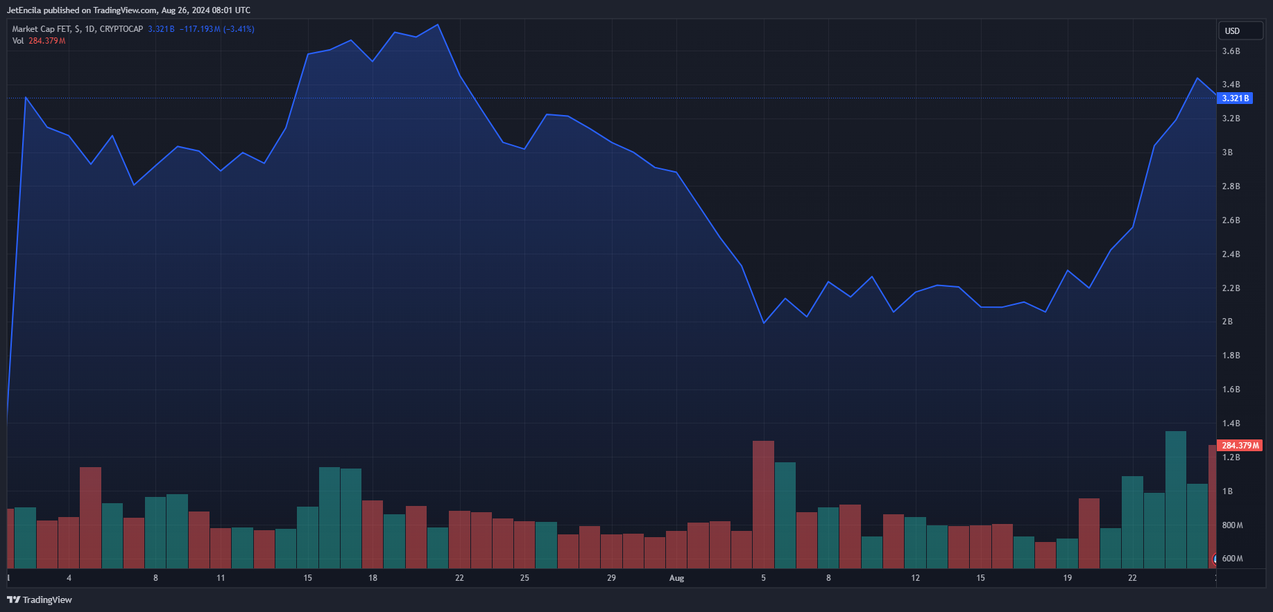 FET market cap currently at $3.3 billion. Chart: TradingViewThe good thing gets to stand out fully when it comes to the nature of this recovery, all things considered. Other focus projects on AI, such as Near Protocol and Internet Computer, have had it in the red in recent times, having shed 14% in the last 30 days. On the other hand, FET showed resilience in this period by being in the green 43% of the days.