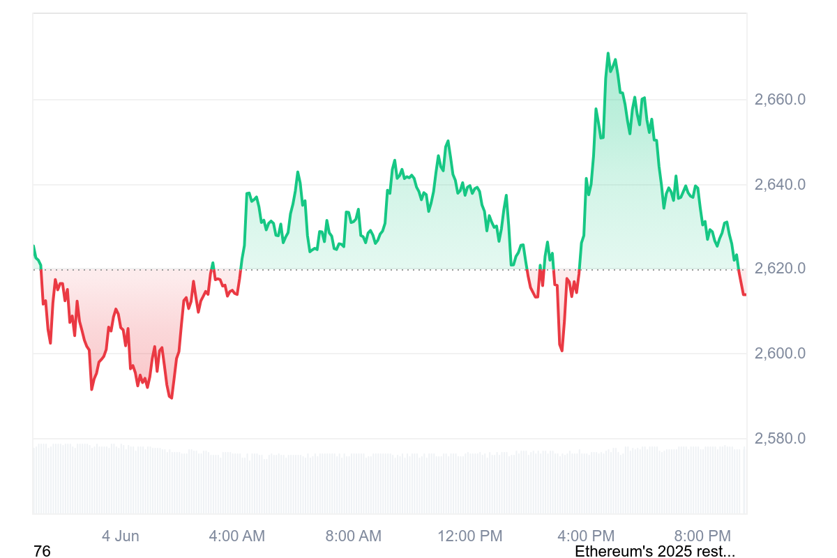 Ціна Ethereum показала як збільшення, так і зменшення протягом дня. Ціна впала нижче $2,600 на початку торгової сесії, але відновилася до $2,670 і тепер знову стабілізувалася приблизно на своєму раннішньому значенні.