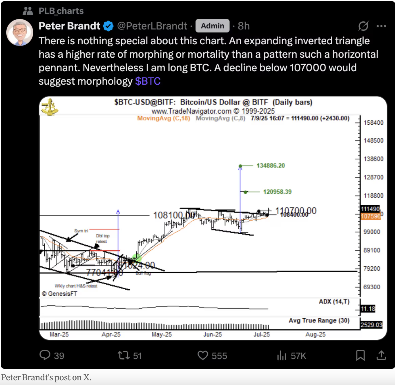 Досвідчений аналітик графіків Peter Brandt також зазначив, що спотовий графік Біткойна також має бичачу структуру, цільове значення прогнозу ціни BTC вказує на $134,000 доларів. Загальний висновок, Біткойн ($BTC) має шанс досягти $140,000 доларів.