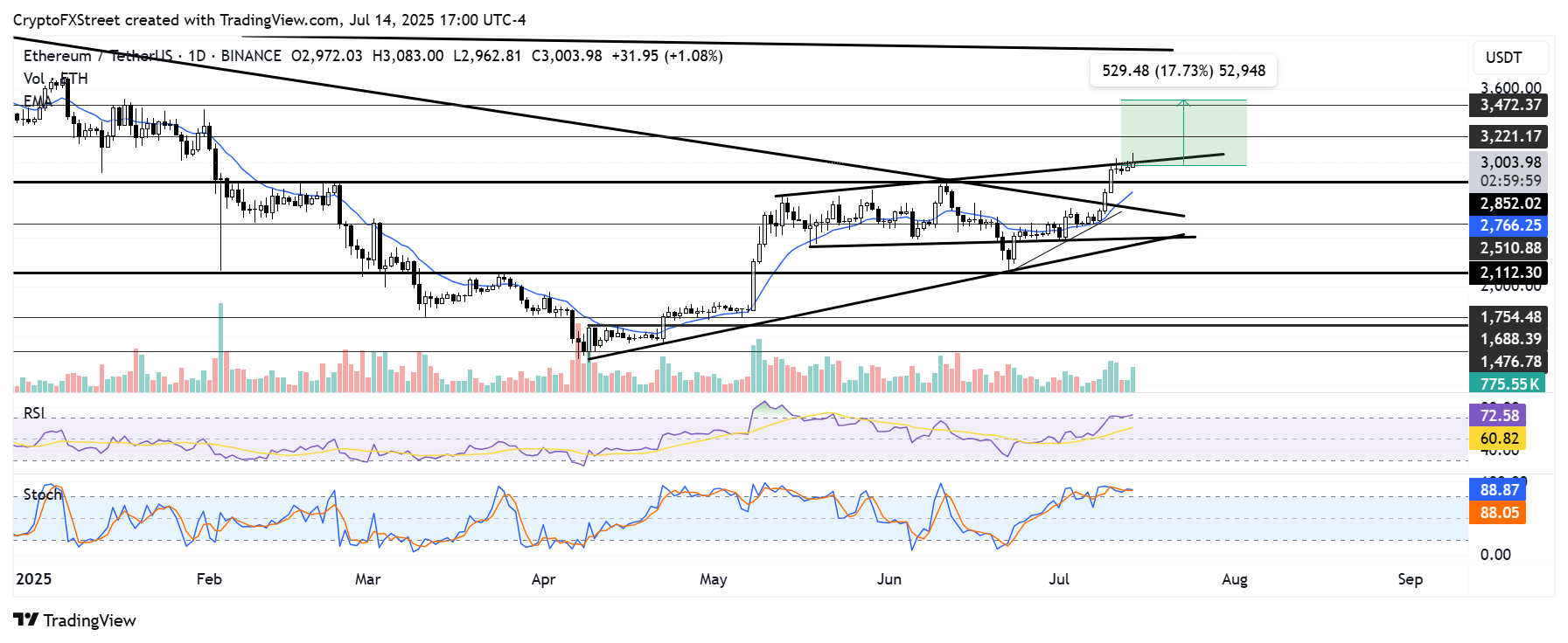 Аналітик FXStreet Майкл Ебіекутан повідомив, що ETH намагається прорвати верхню межу висхідного прямокутного розширювального клина після пробиття позначки в 3,000 доларів, але стикається з сильним спротивом. Якщо ETH подолає цей рівень спротиву та переверне верхню межу клина на рівень підтримки, його зростання може розширитися до 3,470 доларів.