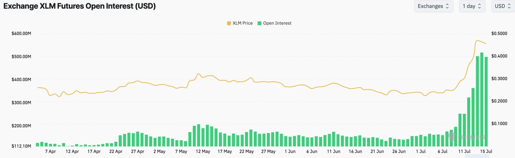 Через зниження відсоткової ставки на ф’ючерси, ціна Stellar може впасти. Дані Coinglass показують, що відкритий інтерес знизився з 520 мільйонів доларів до 495 мільйонів доларів у вівторок. У більшості випадків, коли відкритий інтерес досягає піку, ціни на криптоактиви починають падати.