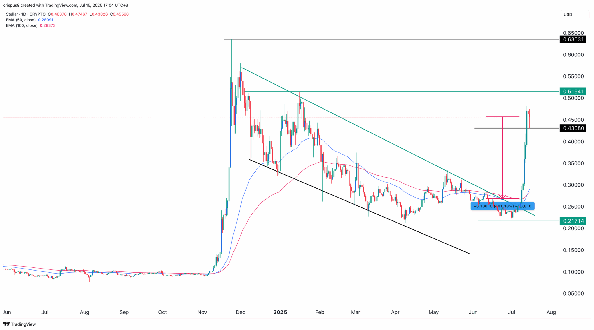 Тому найбільш ймовірним сценарієм є падіння ціни XLM приблизно на 40%, а потім відновлення бичачого тренду. Якщо ціна Stellar перевищить цьогорічний максимум 0.5155 доларів, тоді попередній бичачий прогноз втратить силу.