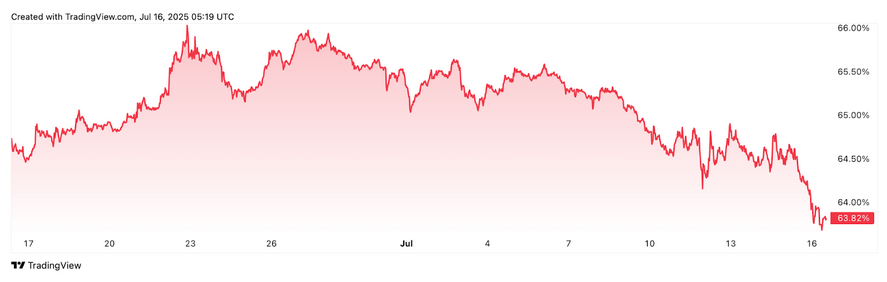 Згідно з даними TradingView, домінування Біткойна (індикатор, що вимірює частку ринку Біткойна) на момент публікації становило 63,82%, зросло на 9,89% з 1 січня.