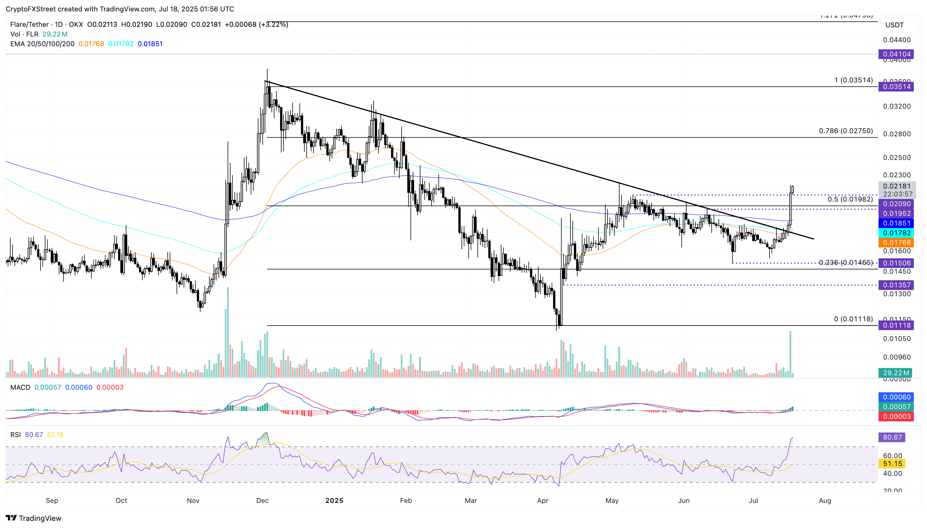 Проте, якщо FLR впаде нижче 0.01982 доларів, він може повторно протестувати 200-денну EMA 0.01851 доларів.