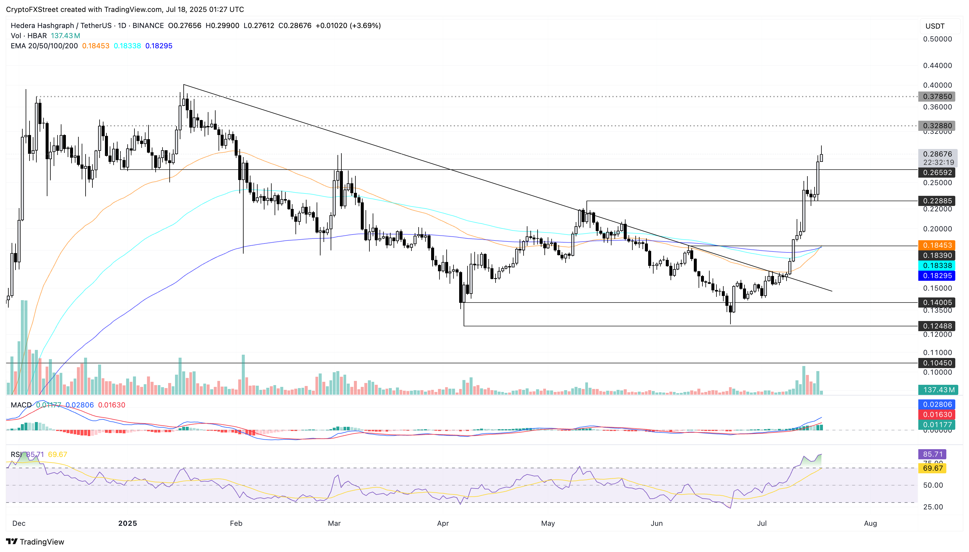 Аналітик FXStreet Вішал Діксіт повідомив, що станом на п’ятницю HBAR зріс майже на 4%, продовжуючи зростання на 17% в четвер. Цей альткоїн досягнув п’ятимісячного максимуму, тестуючи межу у 0,30 долара.