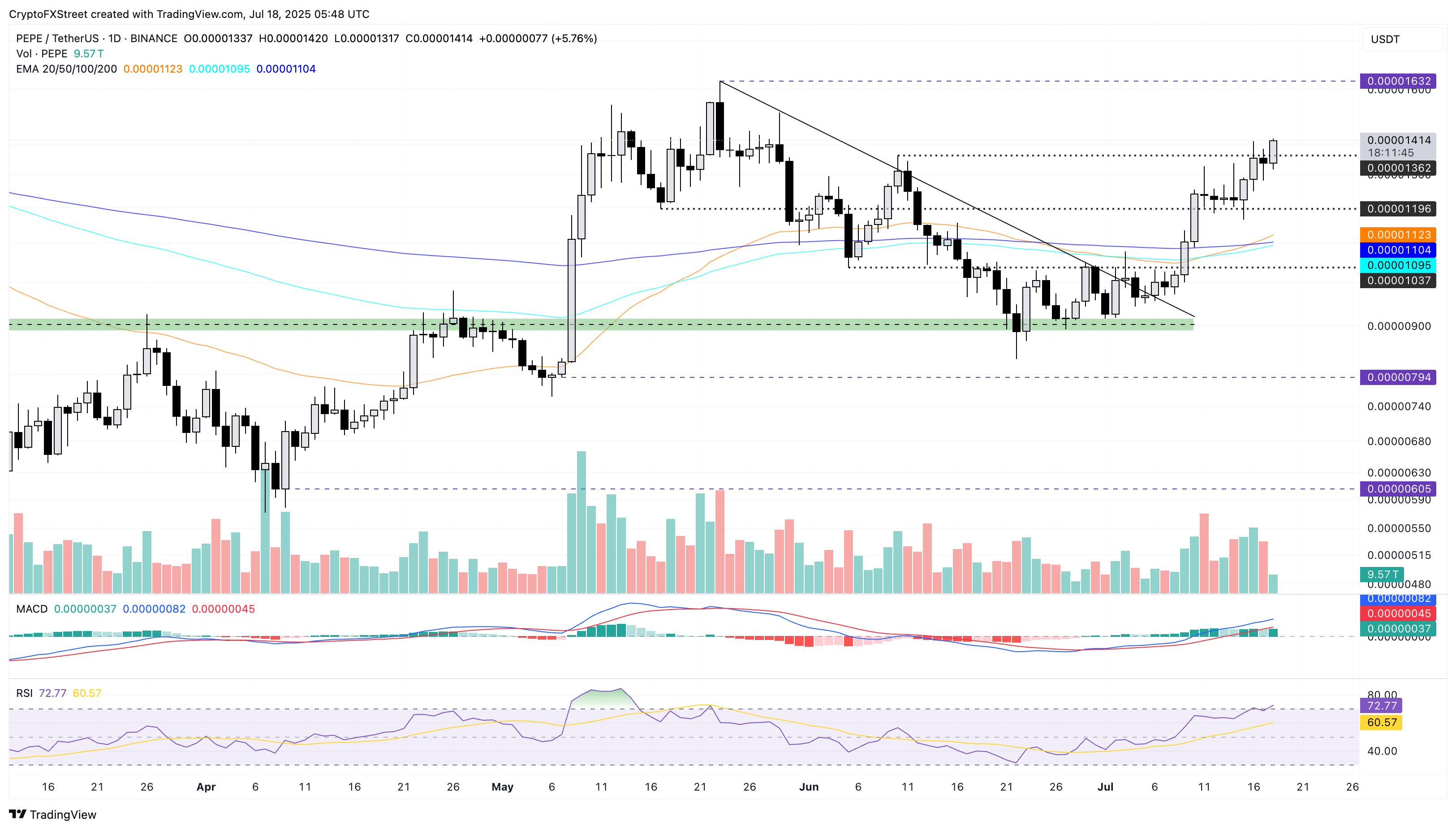 Станом на п’ятницю, на момент публікації, PEPE зріс більш ніж на 5%, відновивши зниження на 1,26% у четвер, продовжуючи поточну тенденцію підйому. Ціна торгівлі цією мем-монетою досягла місячного рекорду, з початку липня вона зросла на 45%.