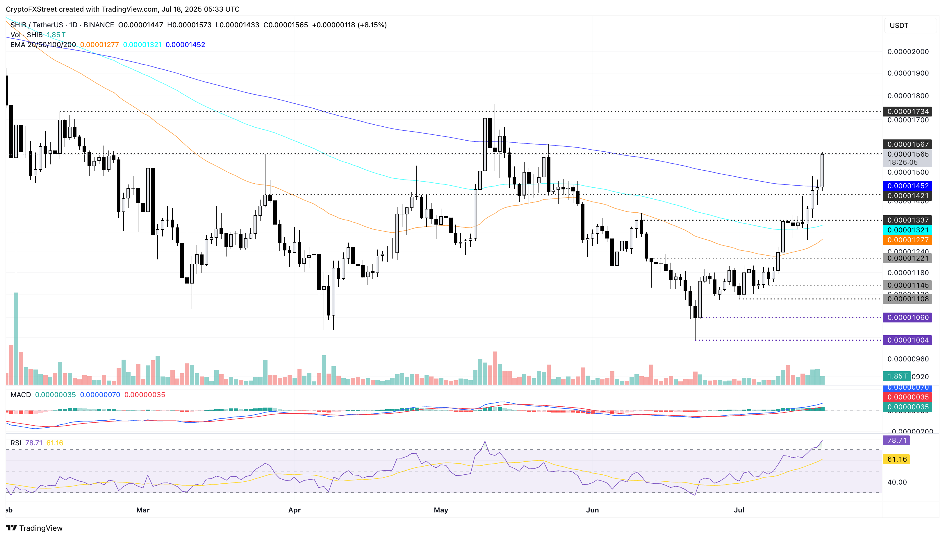 З іншого боку, реверс Shiba Inu може призвести до повторного тестування 200-денного EMA на рівні 0,00001452 доларів.