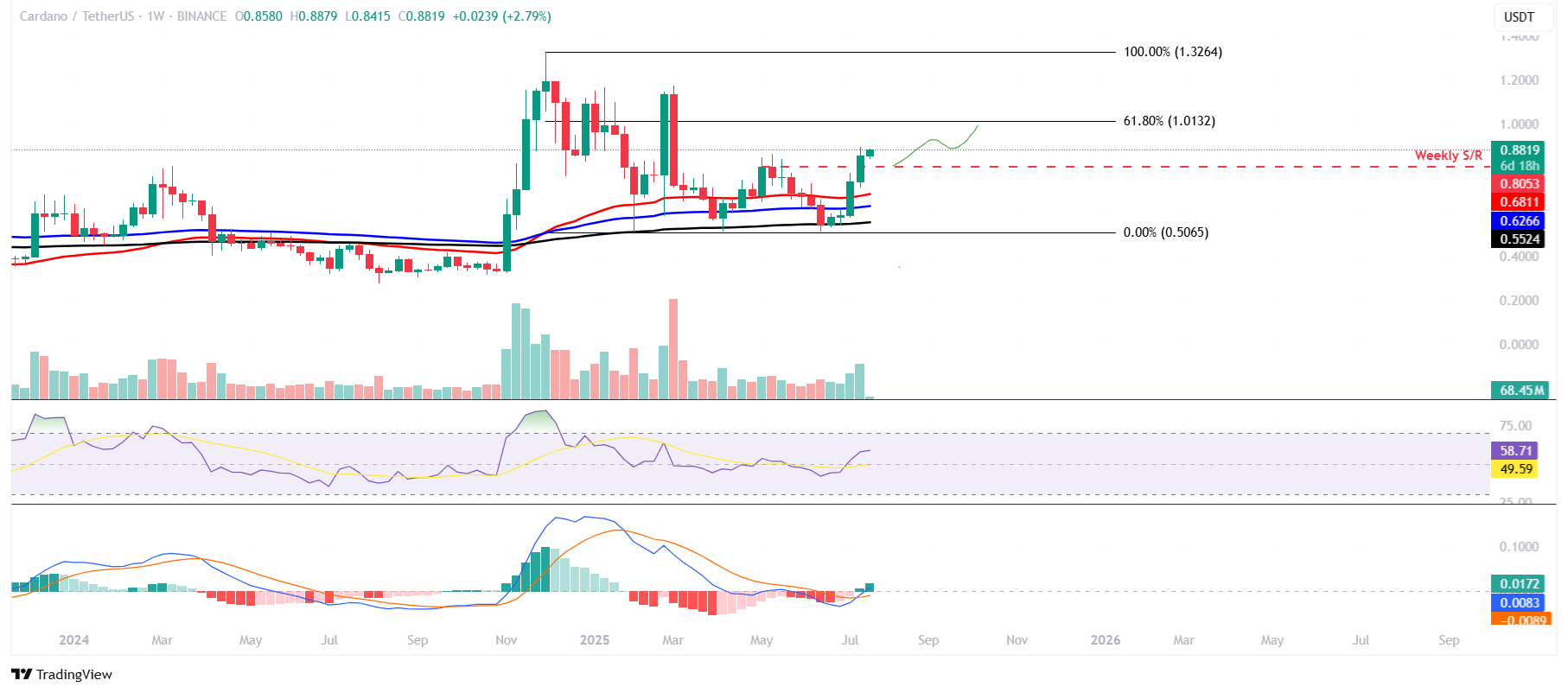 Cardano (ADA) продовжує бичачий тренд, в понеділок, коли писався цей текст, ціна торгів перевищила 0.88 доларів, за останні чотири тижні вона зросла майже на 60%. Дані з похідних інструментів підтримують бичачу точку зору, оскільки незакриті контракти ADA (OI) досягли історичного максимуму, а технічний аналіз показує, що ймовірність того, що цей токен повернеться до психологічної позначки в 1 долар, зростає.