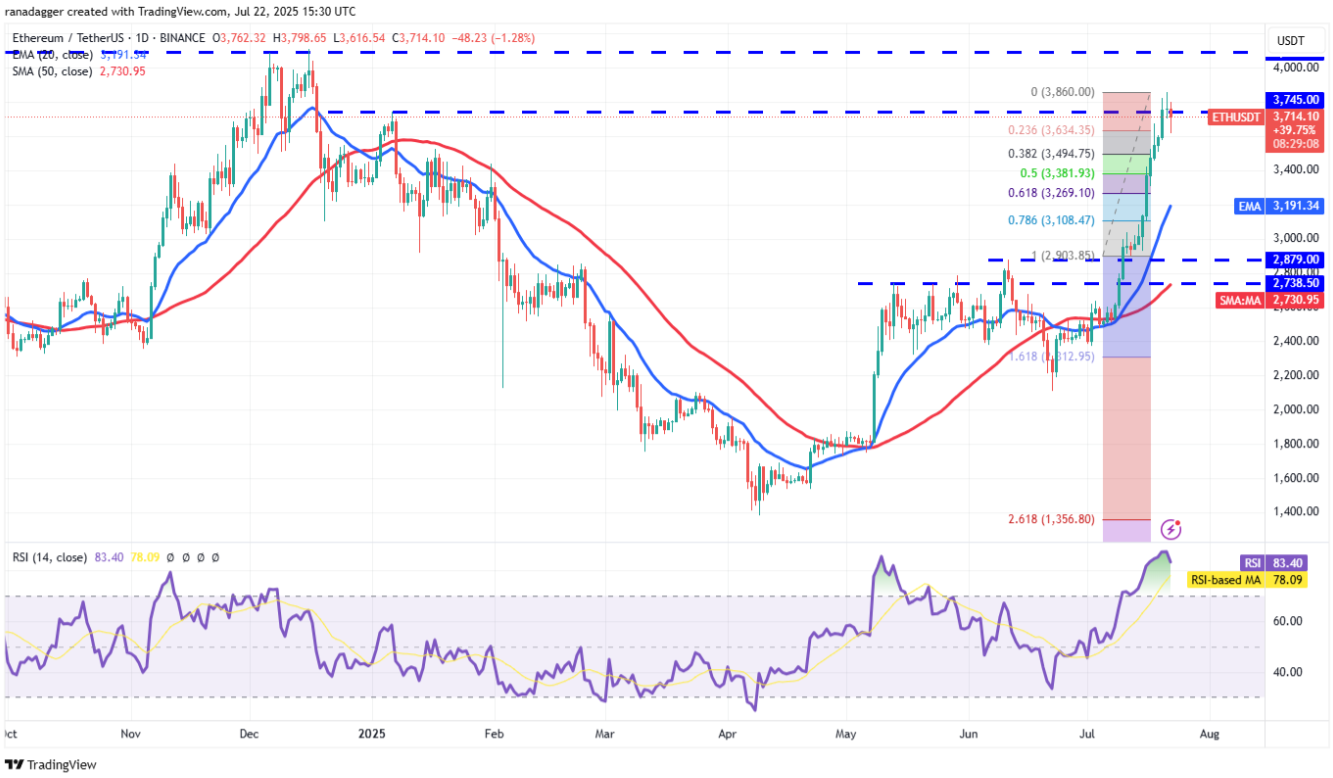 Ціна ETH впала нижче 3,745 доларів, що свідчить про те, що високі рівні зазнають тиску демпінгу. ETH/USDT може відкотитися до 38.2% рівня Фібоначчі 3,494 доларів і далі відкотитися до 50% рівня Фібоначчі 3,381 доларів. Якщо ціна відскочить від цієї підтримки, лонг позиції знову спробують підняти ціну до 4,094 доларів.