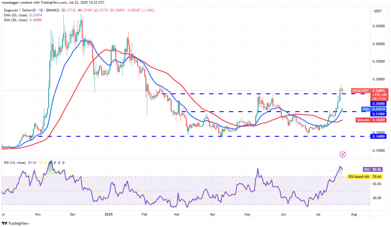 Наразі ведмежі намагаються знизити ціну нижче 0,26 долара. Якщо їм це вдасться, це може затиснути лонг позиції, спонукаючи DOGE/USDT відкотитися до 20-денного середнього ( 0,21 долара ) — очікується, що це викликатиме новий тиск на покупців.