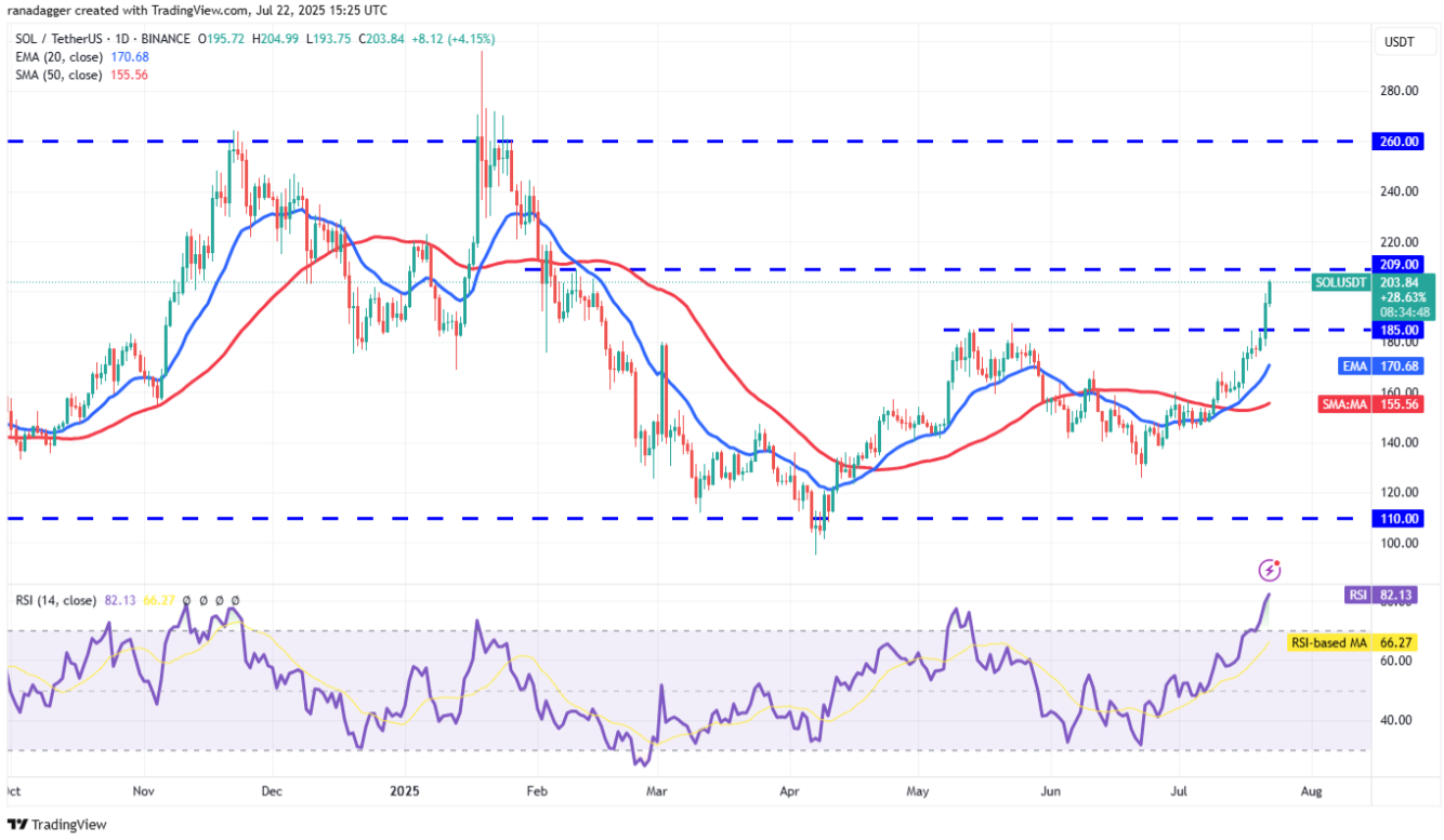 Solana (SOL) сильно прорвався, у понеділок подолавши ключовий рівень опору в 185 доларів, що відкриває шлях для подальшого зростання. Наразі лонг позиції намагаються підняти ціну вище 209 доларів, щоб зміцнити свої позиції.