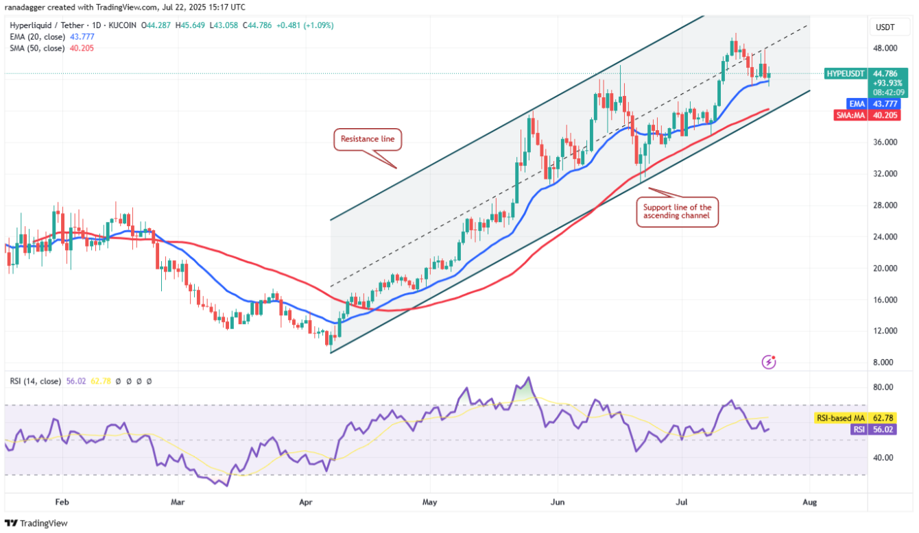 Наразі ведмеді намагаються знизити ціну нижче 20-денного середнього. Якщо їм вдасться, пара HYPE/USDT може ще більше впасти до рівня підтримки на дні висхідного каналу.