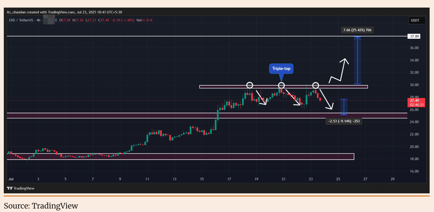 На коротких часових рамках, особливо на 4-годинному графіку, ENS сформував класичну ведмежу трійку цінової формації. Цей альткойн пробив локальний рівень підтримки в $28, що відкрило простір для подальшого зниження ціни.