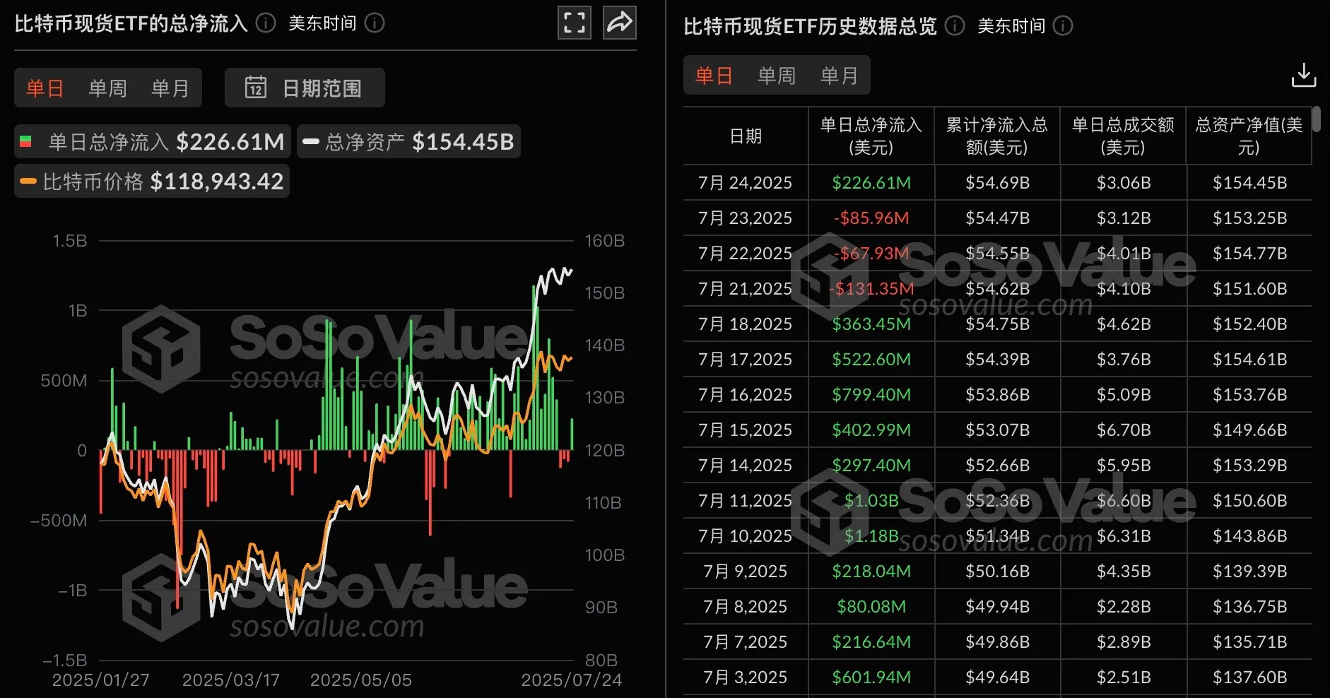 Згідно з даними SoSoValue, вчора (східний час США, 24 липня) загальний чистий приплив Біткойн (BTC) Спот ETF склав 227 мільйонів доларів.