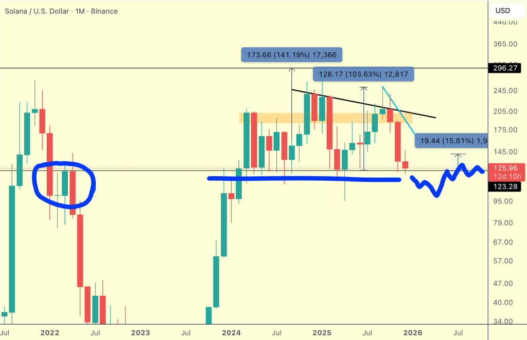 Прогноз ціни Solana: $125 є критично важливою підтримкою для утримання, якщо SOL незабаром має досягти нових висот. Новини про впровадження Solana здивували у 4 кварталі 2025 року, продемонструвавши, що обсяг торгівлі в мережі для пари SOL-USD перевищив спотовий обсяг торгівлі SOL/USD на біржах Binance і Bybit разом взятих, в той час як зростання мережі SOL перевищує очікування, оскільки Circle випустила ще $500M USDC на Solana. Ось як виглядає справжнє впровадження. На місячному графіку ціна $125 залишається основним рівнем підтримки з 2022 року. Кожного разу, коли SOL вдавалося відновитися та утримуватися вище цього рівня, він досягав значних прибутків. Проблема в тому, що ці прибутки стають усе слабшими: 141%, 103% і останній, лише 15% до цього часу. Ця все більш слабка компресія може бути важливою для спостереження, оскільки, якщо вона залишиться вище $125, прогноз ціни Solana залишиться бичачим на 2026 рік. Але зниження може сигналізувати про повторення патерну 2022 року, коли SOL пережив ведмежий ринок.