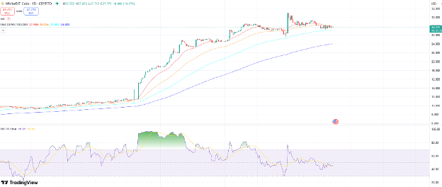 В суботу ціна WBT зазнала відмови на 50-денної експоненціальної ковзної середньої (EMA), яка виступає як опір на рівні $28.03, що збігається з рівнем опору за день. На момент написання в понеділок о 14:14 (UTC) ціна торгується близько $27.75.