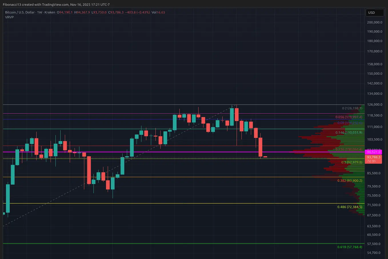 Ціна Біткойна закрилася нижче рівня підтримки в $96,000, визначеного в попередні тижні. Закриття поблизу мінімумів нижче цього рівня надає дуже мало шансів, якщо такі є, на відновлення ціни та відновлення бичачого ринку найближчим часом. Дивлячись нижче, у нас є наш наступний основний рівень підтримки нижче на 0.382 Фібоначчі від дна 2022 року до максимуму жовтня 2025 року, і ще один вузол високого обсягу, що знаходиться в зоні $83,000 до $84,000. Нижче цього рівня ми будемо дивитися на максимуми зони консолидації 2024 року між $69,000 і $72,000.
