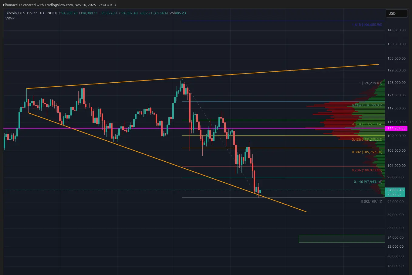 Бики внизу і без сил. Сидячи на рівні близько 94 000 доларів, біткойн впав більш ніж на 25% від жовтневих максимумів. Мало надії на будь-який значний ралі або нові максимуми після втрати основних рівнів підтримки.