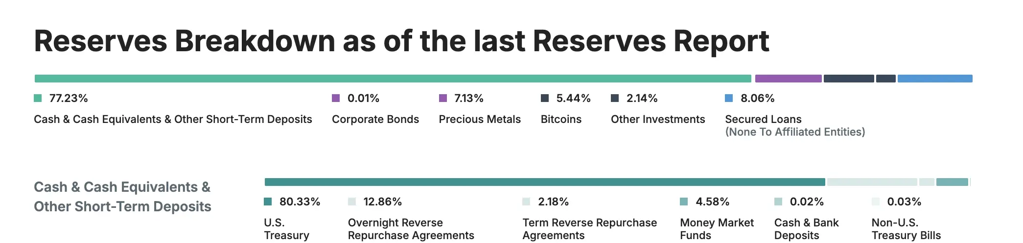Згідно зі звітом про прозорість Tether, понад 80% резервів компанії зберігаються у казначейських облігаціях США. Це робить Tether великим учасником глобальної екосистеми державного боргу США і навіть 17-м за величиною власником американського держборгу у світі, випереджаючи багато суверенних держав.