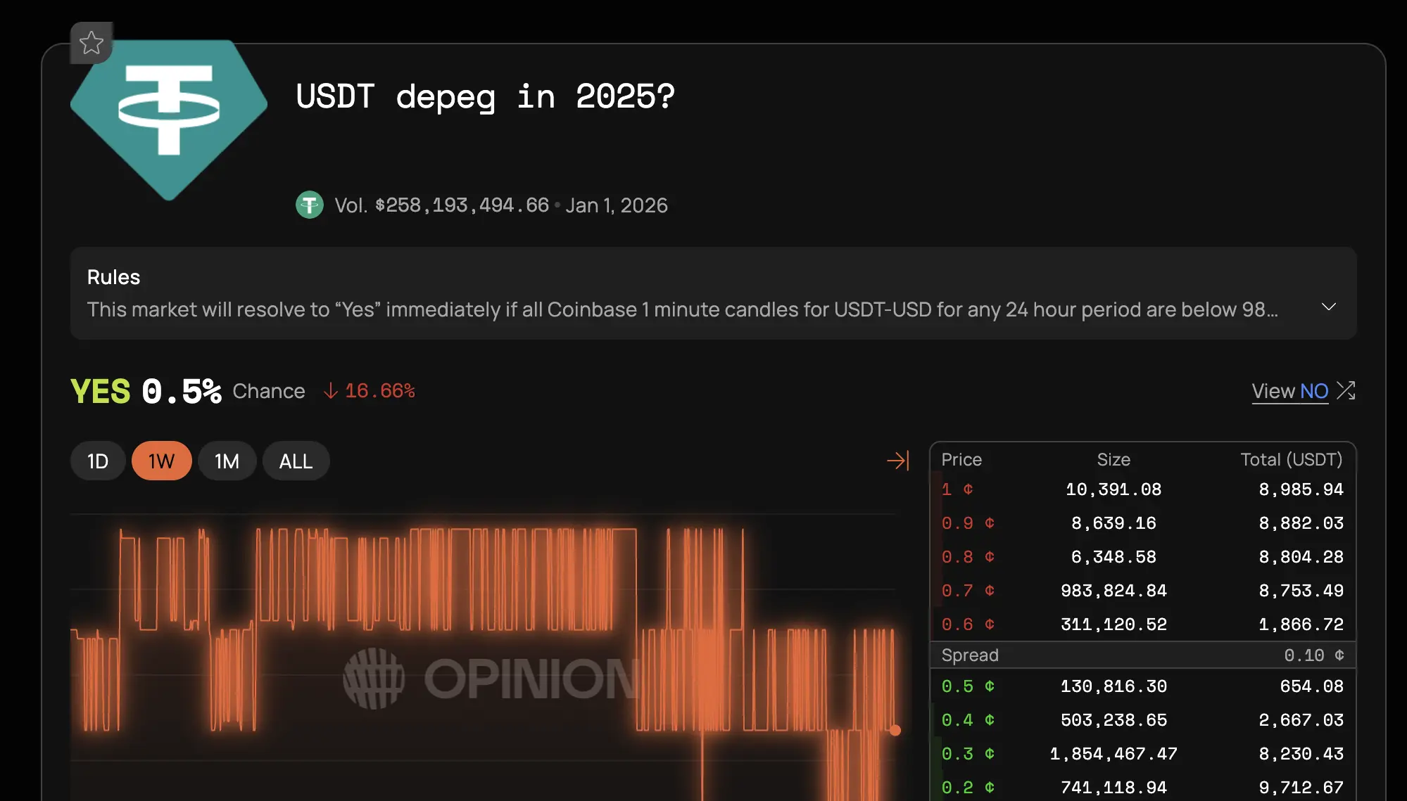 Попри ці макроекономічні ризики, більшість учасників ринку вважають малоймовірною примусову втрату прив’язки Tether. Трейдери на ринку прогнозів Opinion оцінюють ймовірність цього сценарію у 0,5%, що свідчить про високий скептицизм інвесторів.