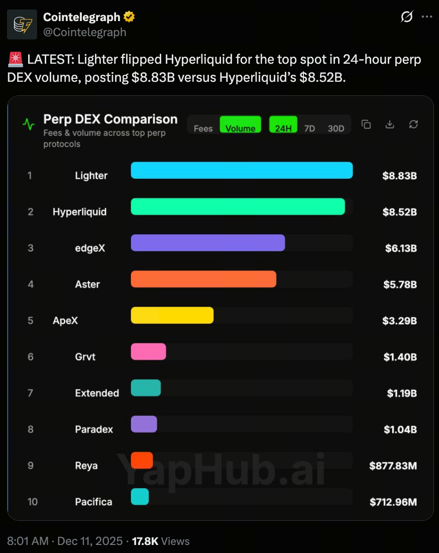 Theo Cointelegraph ngày 11 tháng 12, Lighter ghi nhận khối lượng giao dịch hợp đồng vĩnh cửu trong 24 giờ đạt 8,83 tỷ USD, nhỉnh hơn Hyperliquid với 8,52 tỷ USD, qua đó vươn lên vị trí dẫn đầu các Perpetual DEX. Thành tích này đã đưa Lighter trở thành tâm điểm thị trường trong thời gian ngắn.