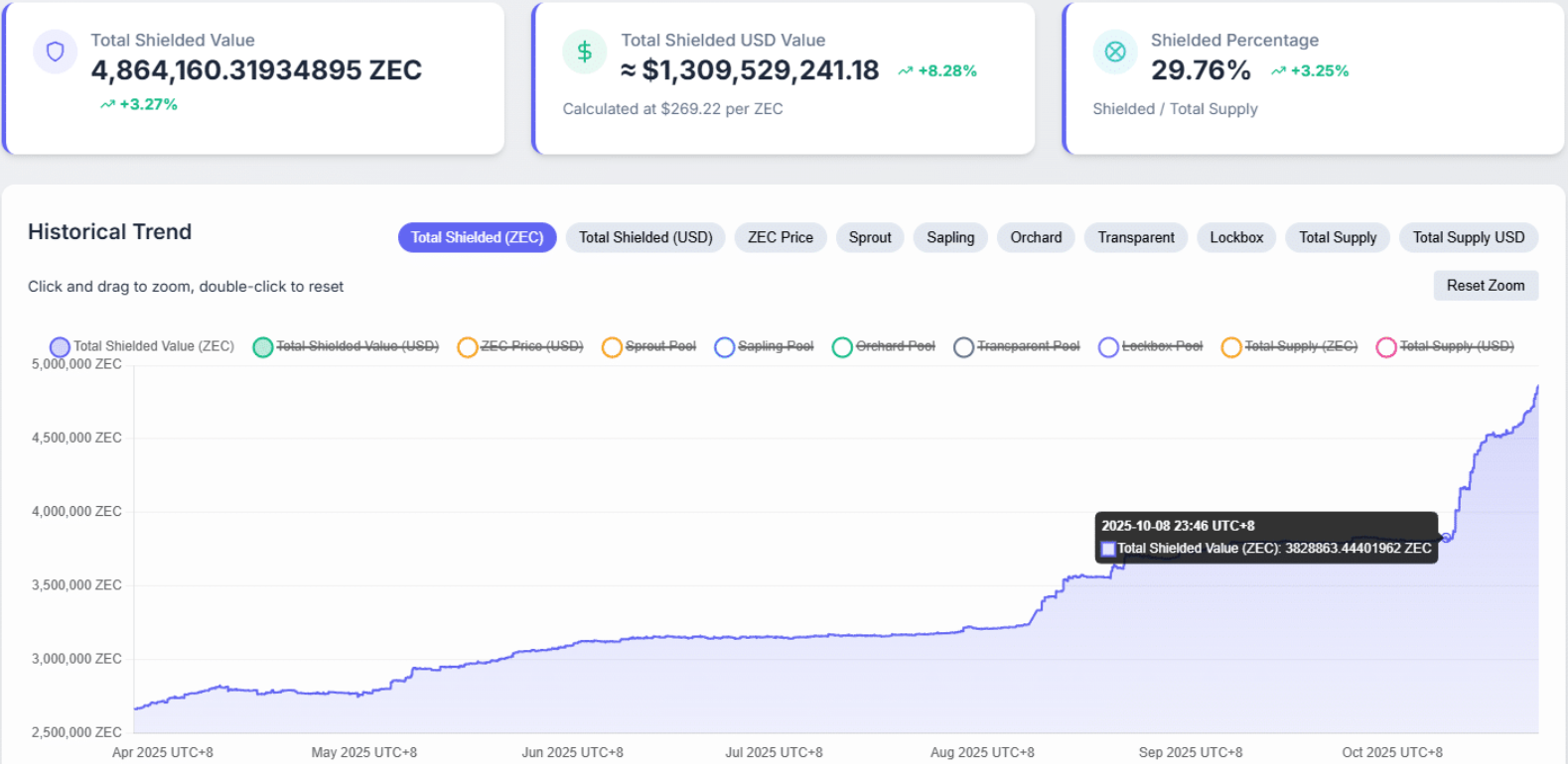 Hiện nay, gần 30% tổng nguồn cung ZEC đã được ẩn danh hóa — một con số cho thấy mức độ ứng dụng các tính năng bảo mật trên chuỗi đang tăng trưởng mạnh mẽ.