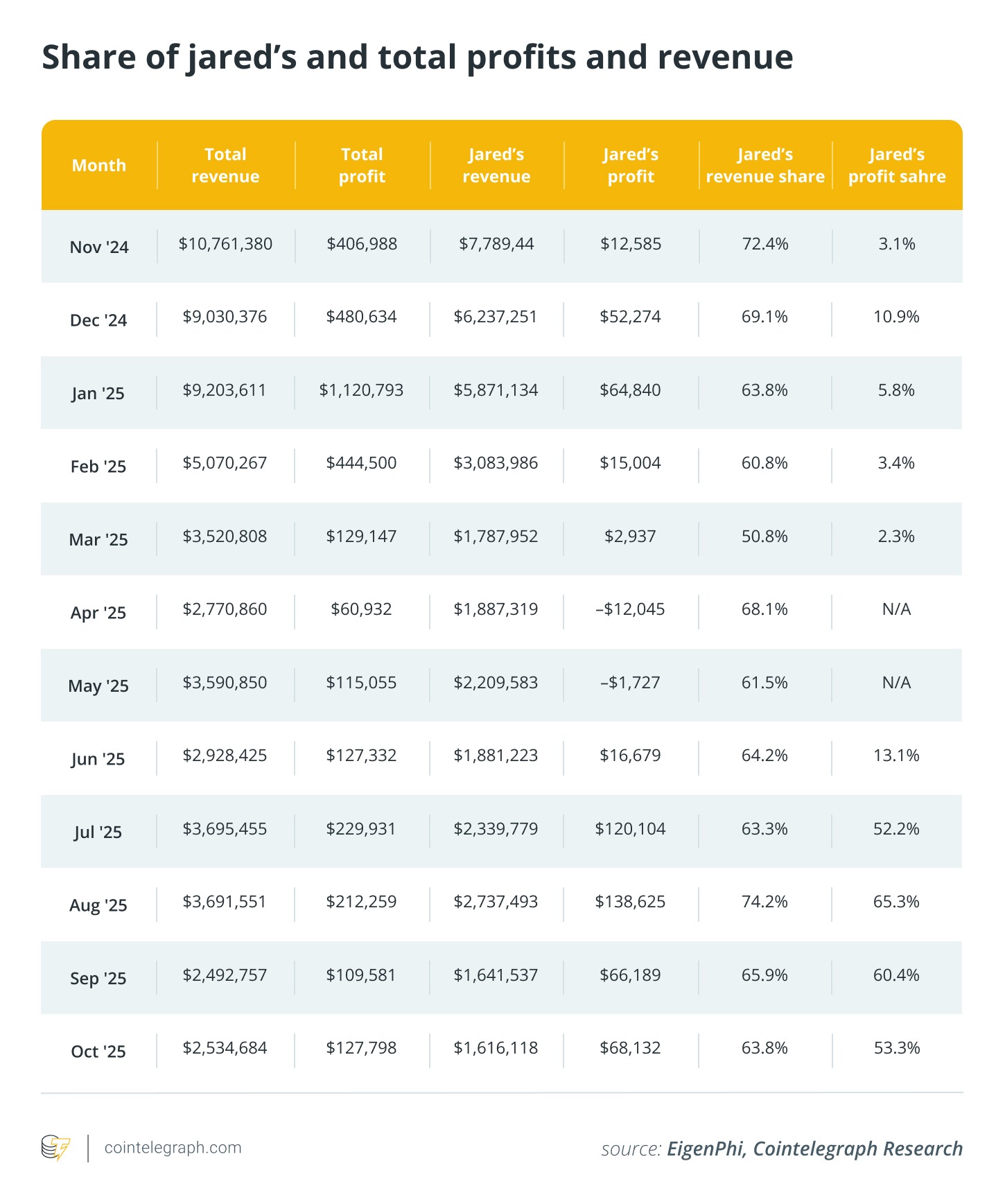 Dữ liệu cho thấy chiến lược của Jared là hiệu quả nhất cho đến nay. Chiến lược này ưu tiên số lượng và tận dụng hầu hết các cơ hội sandwich có sẵn, kể cả những cơ hội nhỏ chỉ mang lại lợi nhuận vài xu. Trong phần lớn năm 2025, chi phí gas duy trì ở mức thấp so với doanh thu trên mỗi cuộc tấn công, khiến mô hình này khả thi hơn trước đây. Tuy nhiên, Jared vẫn có lúc bị lỗ. Tháng 4/2025, biên lợi nhuận của Jared là âm 20%, tương đương với khoản lỗ khoảng 12.000 đô la.