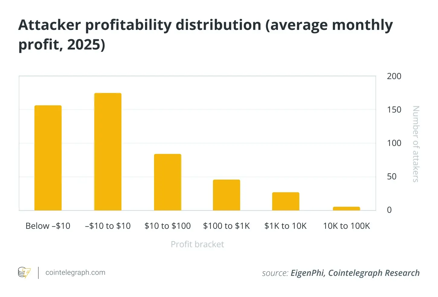 Lợi nhuận trung bình trên mỗi cuộc tấn công sandwich vẫn cực kỳ thấp, chỉ trên 3 đô la một chút. Chỉ có sáu kẻ tấn công tạo ra hơn 10.000 đô la tổng lợi nhuận, cho thấy con đường để duy trì lợi nhuận ổn định trong lĩnh vực này ngày càng hẹp. Khoảng một phần ba tổng số bot sandwich đang hoạt động trong năm 2025 hoạt động ở mức hòa vốn ( -$10 to $10 ), trong khi khoảng 30% ghi nhận lỗ ròng. Các bot thường bị lỗ do cạnh tranh cao cho một tập hợp cơ hội hạn chế, tính toán sai trượt giá và chi phí gas. Biên lợi nhuận quá mỏng để hấp thụ những sai sót này.