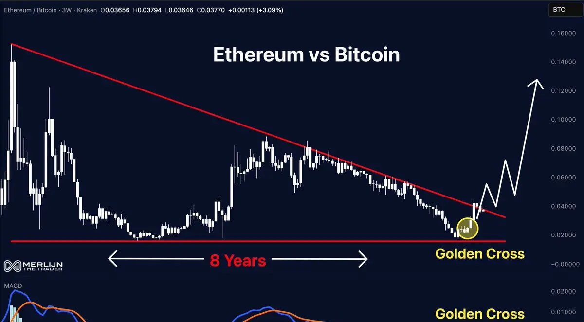 Ngoài ra, một nhà giao dịch khác đã đăng một biểu đồ ETH/BTC riêng biệt cho thấy một sự di chuyển vượt qua một đường xu hướng đã giữ vững trong tám năm. Sự bứt phá xảy ra sau khi ETH bật lên từ mức hỗ trợ dài hạn gần 0.020. Sự thay đổi trong cấu trúc này có thể gợi ý một sự thay đổi trong động lực.