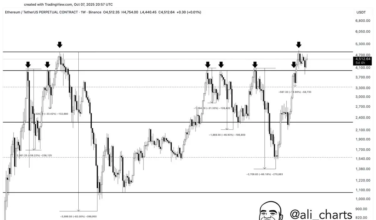 Khoảng từ $4,000 đến $4,800 đã được gọi là "vùng nguy hiểm" của Ethereum kể từ năm 2021. Một biểu đồ cho thấy ETH đã thất bại ở mức này nhiều lần, thường dẫn đến những đợt giảm mạnh. Sáu lần từ chối trước đó đã dẫn đến những mức giảm từ 31% đến hơn 80%.