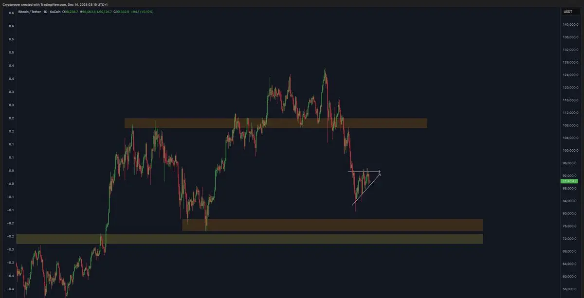 Biểu đồ của Crypto Rover phác thảo hai hướng đi chính dựa trên cách giá phản ứng với mô hình nén đang hình thành trên các khung thời gian nhỏ hơn. Nếu Bitcoin mất mức hỗ trợ tăng và phá vỡ, biểu đồ gợi ý một sự di chuyển về phía dải thanh khoản thấp hơn nằm trong khoảng $78,000–$82,000.