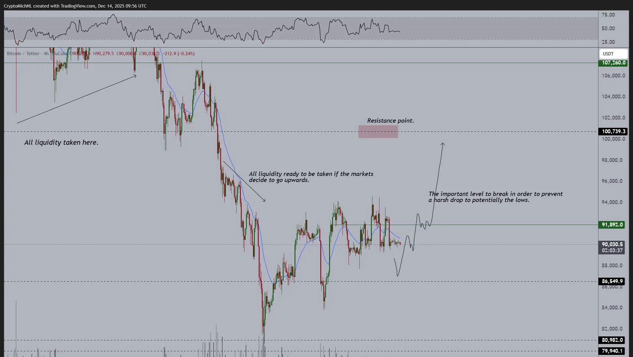 Ông cũng nhấn mạnh rằng khối lượng giao dịch gần đây thấp khiến hành động giá trở nên không ổn định. Dù vậy, ông vẫn tự tin rằng một hướng rõ ràng hơn sẽ xuất hiện sớm, và ông tin rằng bước đi quyết định có khả năng xảy ra trong tuần tới. Biểu đồ của ông mô tả một kịch bản trong đó thanh khoản dưới các mức thấp gần đây được lấy đi trước, sau đó phục hồi hướng tới kháng cự quanh $100,700, miễn là Bitcoin có thể giữ vững vùng trung bình $90,000.
