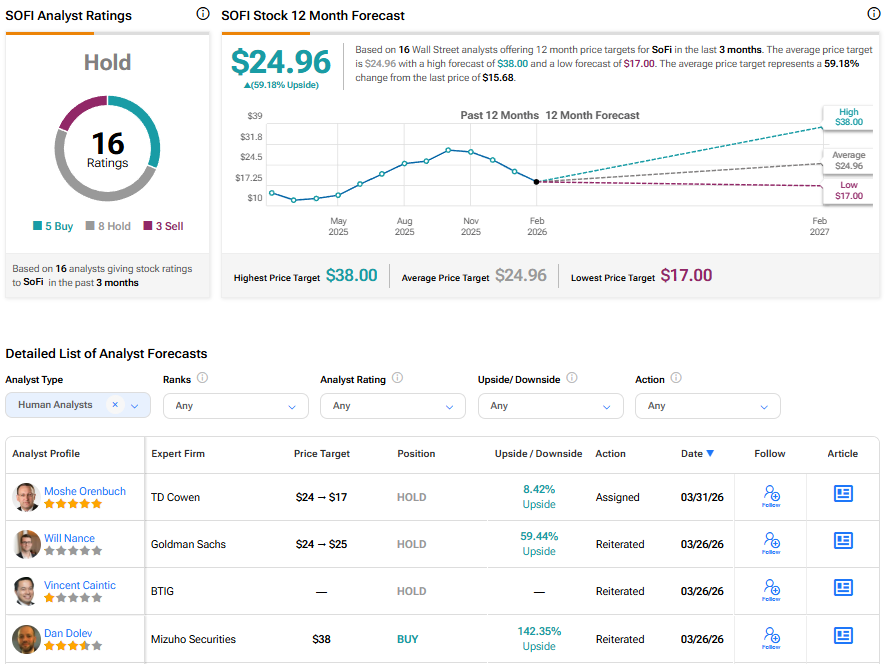 Wall Street có đánh giá Đồng thuận là Giữ đối với cổ phiếu SoFi dựa trên năm khuyến nghị Mua, tám khuyến nghị Giữ và ba khuyến nghị Bán. Mục tiêu giá trung bình của cổ phiếu SOFI là 24,96 đô la, cho thấy tiềm năng tăng giá 60,05%.
