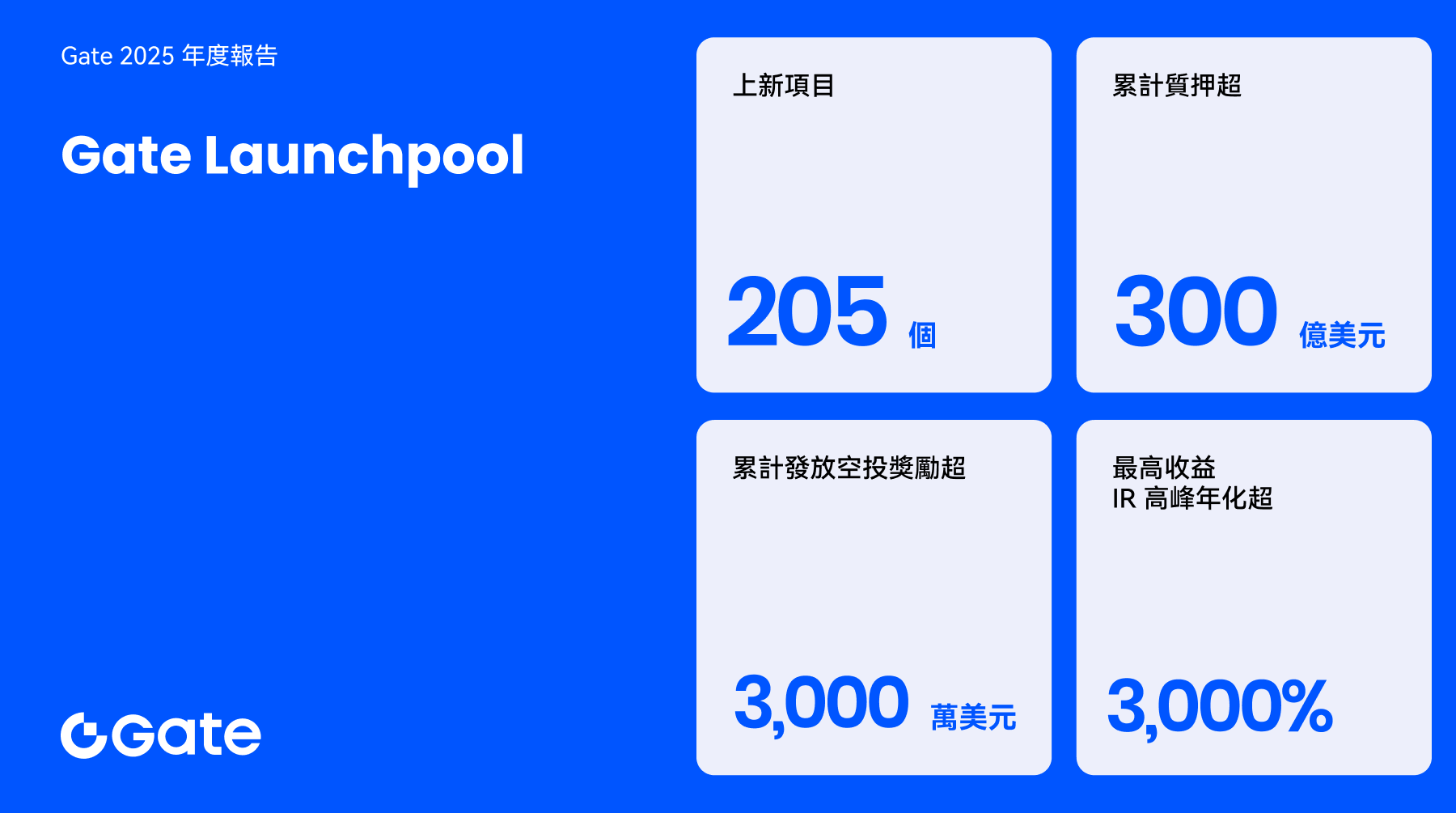 2025 年,Gate Launchpool 持續保持高頻、穩定的專案上線節奏,全年累計上線新專案達 205 個,累計發放空投獎勵超過 3,000 萬美元,為用戶提供多樣化、具備吸引力的收益參與機會。年內 Launchpool 吸引累計參與人次超過 32 萬,平台質押資金規模合計突破 300 億美元,反映用戶對平台專案篩選機制與收益模型的持續認可。