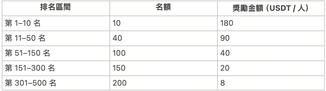 - 在交易排名賽中,若所有參賽用戶都未達到單人最低合約交易量要求,則對應的空投獎勵將不予發放。所有達到最低交易量要求的用戶,將依據達成時間先後順序,依序獲得前 100 名固定獎勵名額。