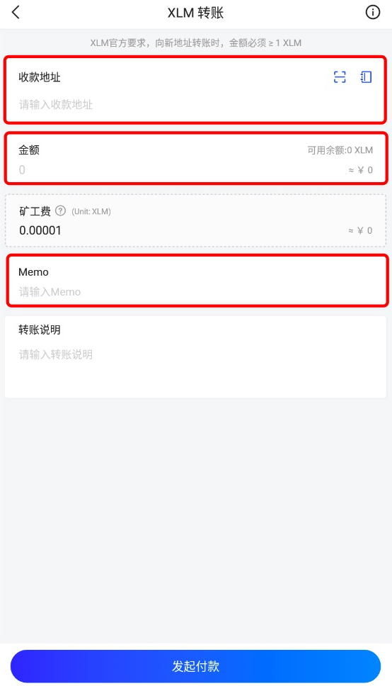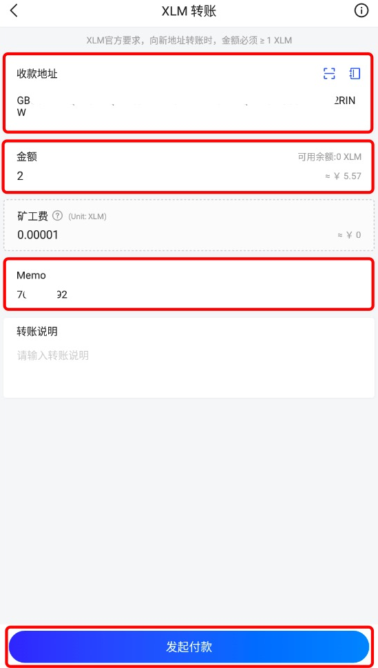 8. 復制XLM充值地址和Memo等信息,正確填寫在Wallet.io錢包中的轉幣頁面(收款地址、Memo、轉帳金額),點擊“發起付款”。