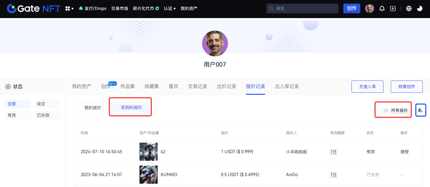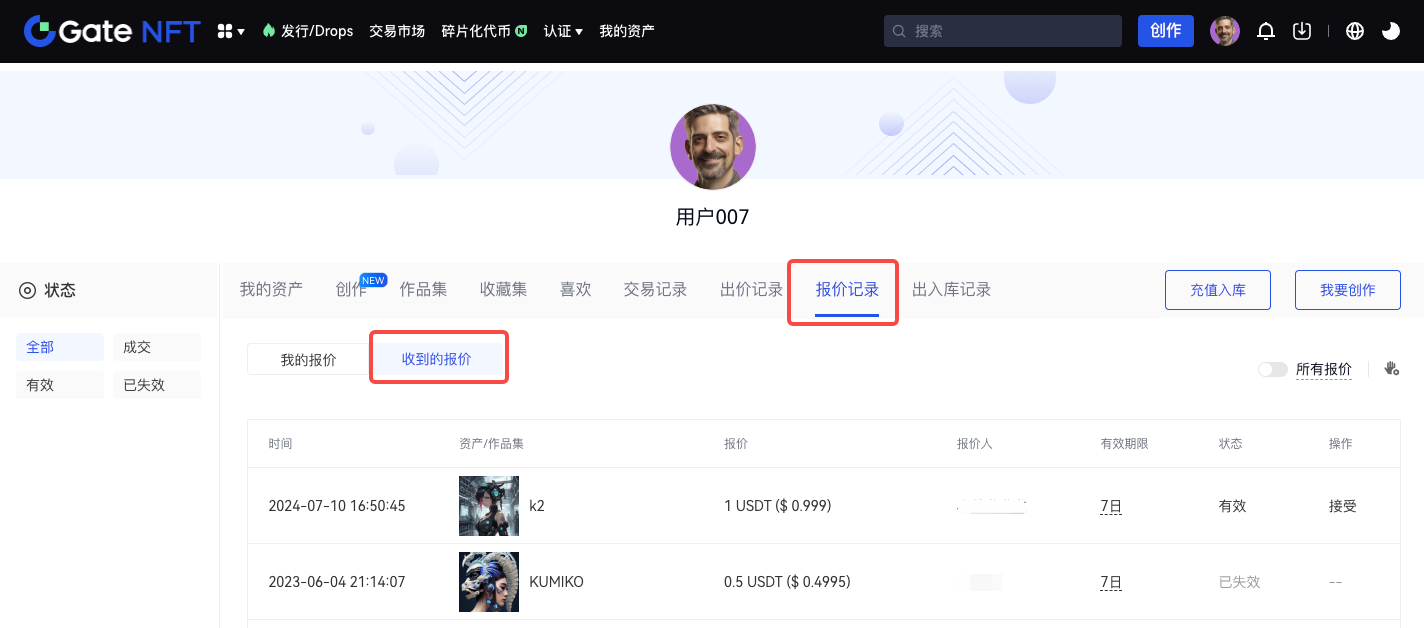 Step 2:在我的資產頁面點擊報價記錄,並點擊「收到的報價」,此時您可以看到您持有的NFT 資產所接收到的報價,您可以選擇接收有效期內的任意報價,接收報價後將立即達成交易。