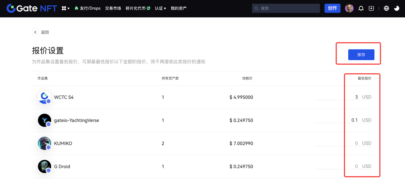 Step 2:在最低報價設置頁面,選擇您要設置最低報價的 NFT 作品集,在右側的輸入框內輸入您要設置的最低報價金額,並點擊「保存」按鈕,保存後對於該作品集內的所有資產,您將不再接收設定金額以下的報價通知。