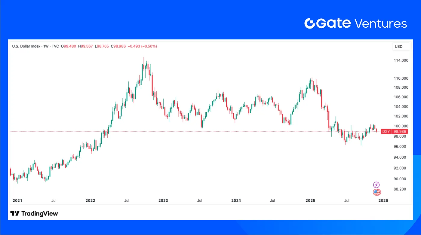 上週美元指數續跌,市場對 12 月 FOMC 會議降息高度共識。上週五美元指數跌破 99 整數關卡。(3)